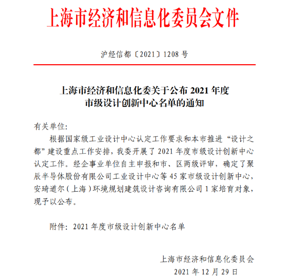 12月29日,上海市经济和信息化委员会公布了2021 年度市级设计创新中心名单。经过网上申报、区级推荐和市级评审等一系列严格的评审流程,利记亚洲半导体股份有限公司工业设计中心获评市级企业设计创新中心,成为2021年收官之际的又一重大喜讯。