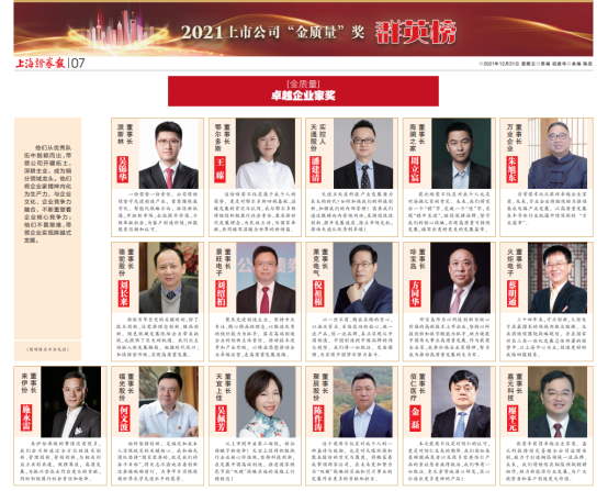 凭借着对上市公司群体30年的关注与记录,秉承公开、公平、公正原则,“金质量”奖已成为国内上市公司领域内最权威、最具影响力的奖项之一。“金质量”奖聚焦公司治理完备、成长性佳、具备科创力和社会影响力的上市公司,聚集行业内有超凡远见、卓越才能的公司掌门人,汇聚持续为公司、股东、投资者创造价值的优秀董秘,聚合为公司规范运作、可持续发展保驾护航的优秀财务总监,共同助推企业高质量发展,夯实资本市场全面深化改革的“压舱石”。